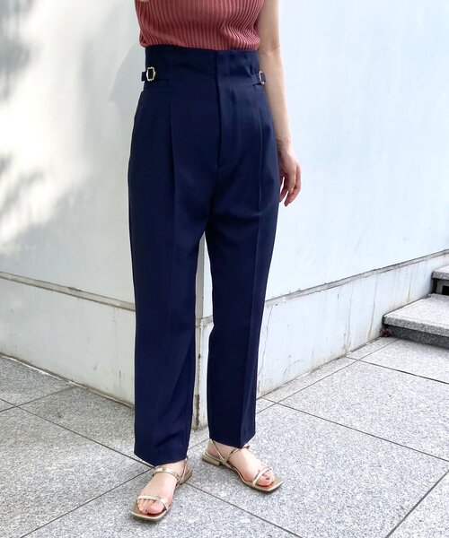 サイドにベルトデザインをあしらった、きれいめストレートパンツ。 【素材】 程よいシャリ感と落ち感が今の時期にぴったりな素材を使用。 ストレートパンツのシルエットが程よくきまる素材感できれいめに穿いて頂けます◎ ※ライトブルー(091)はやや透け感があるため、インナーの着用をおすすめします。 ※裏地なし 【シルエット】 裾にかけてすっきり、すとんとおちるようなストレートのシルエット。 サイドにベルトデザインがついており、ウエスト部分の多少の調整ができます。 少しハイウエスト気味に設定しているので、きれいなラインにみせてくれるのもポイント◎ ※ポケット数:横×2 後(フェイク)×2 【こだわり】 ONでもOFFでも着用できる、今年らしいカラー展開がポイントのきれいめパンツ。 サイドのベルトデザインが、調節できるだけでなくインしたときにさりげないポイントになってくれます。 マシンウォッシャブル機能つき。 こちらの商品は主に夏に着用いただける商品です。 モデル情報:身長172cm B83 W59 H87 着用サイズ:38(M) 店舗へのお問い合わせ商品番号:N02-64006 ●製品寸法: 36(S):W64~68cm H84cm 股下64cm 前股上34cm 渡り幅28cm 裾幅17cm 38(M):W68~72cm H86cm 股下65cm 前股上35cm 渡り幅29cm 裾幅18cm 備考: