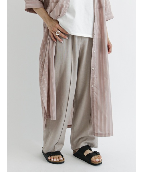 センタープレスのようなピンタックがポイントになったイージーパンツ。 Iラインを強調することでスタイルアップ効果も狙えます。ウエストは総ゴム仕様で安心感のある穿き心地なのも魅力のひとつ。 シンプルなデザインでオンオフとわずに 活躍してくれるアイテムです。 ※商品画像は、撮影環境やお客様のご利用のPC・スマートフォンのモニター環境などにより実物と色味に差異がある場合がございます。 【その他採寸】 F ウエスト:[ゴム仕様] 64cm