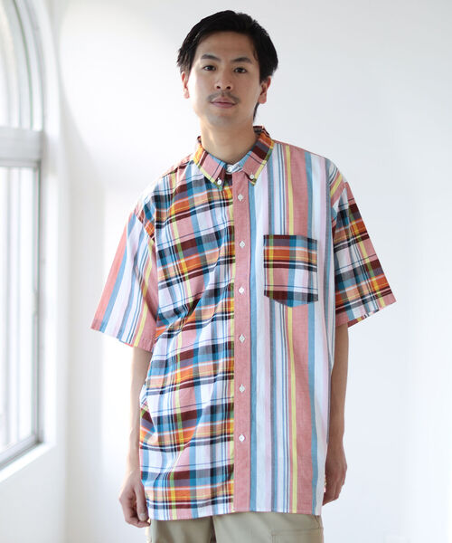 2つの柄のクレイジーパターンがポイント快適な着心地のコットン素材を使用。同系色のチェックとストライプをパーツごとに切り替えたデザインが特徴。チェックの横のペンを抜いて作成したストライプを用いているので、全体的に統一感のあるのもポイントです。身幅がゆったりとしたルーズシルエット。スタイリングのアクセントになる1着です。Model:H179cm W57kg Size:M※商品の色味は白背景商品単体で撮影した画像をご参照ください。※屋外撮影による光の当たり具合やパソコンなどの閲覧環境によって、実際の色味と異なって見える場合がございます。予めご了承ください。生地の厚さ:やや薄手透け感:ややあり伸縮性:なし光沢感:なし裏地:なし【スタッフレビュー】スタッフ:BAKU身長:185cm / 普段サイズ:XL / 着用サイズ:Lサイズ感: ルーズシルエットなので僕でLサイズで着用できます!素材感: 清涼感のある薄手のコットンを使用しているので、これからにピッタリの素材です!ポイント: 同色クレイジーパターンなので遊び心は勿論、チャレンジし易いです!【スタッフレビュー】スタッフ:Noza身長:176cm / 普段サイズ:XL / 着用サイズ:XLサイズ感: 大振りなフィットですが、あえてサイズアップでフィットを楽しんでほしいです!素材感: 柔らかく軽い着心地の薄手のマドラスチェック。ポイント: 見慣れた配色のマドラスチェックなので、洗いざらしで着るのがおススメです!