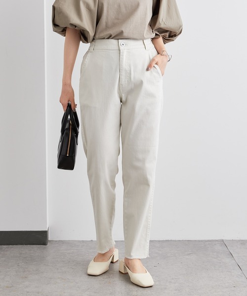 ピュアルセシン 2022 SS collection【classical fragrant】 ◇シンプルで使い勝手抜群なデニムパンツ◇ ●デザイン どんなアイテムとも組み合わせしやすいシンプルなデニムパンツ。 裾にかけて細くなるテーパードシルエットは、脚のラインをカバーして美脚に見せてくれます。 ウエスト後ろはゴム仕様。高いストレッチ性があるのでデニムなのにリラックスした穿き心地を実現しました。 裾は切りっぱなしフリンジで抜け感もあり、カジュアルコーデからキレイめコーデまで幅広く活躍してくれます。 ●カラー展開 アイボリー/ブルー/インディゴブルーの3色展開。 ●素材 軽やかな素材でストレッチ性が高いので動きやすく、ラフな着心地です。 ●スタイリング カジュアルなTシャツやキレイめな雰囲気のシャツブラウスなど幅広く着回し可能。 ワンピースやチュニックなど、着丈の長いアイテムと合わせてもレイヤードしやすいのでおすすめです。 =============================== 透け感:なし 裏地:なし 伸縮性:あり 光沢感:なし 生地の厚さ:やや薄手 【スタッフコメント】 年齢:20代半ば/身長:154cm/普段着用サイズ:Mサイズ サイズ感:足首が隠れるジャストなパンツ丈です。 素材感:伸縮性があり自転車も楽々。やや薄手なので真夏でも着やすそうです。 =============================== ※撮影場所やお使いのモニター環境により若干お色味が異なる場合がございます。特にロケの撮影では明るく見える傾向にございます。 ※予約商品はサンプルで撮影をしております。若干の仕様が変更になる場合がございますので予めご了承の上ご注文くださいますようお願いいたします 。