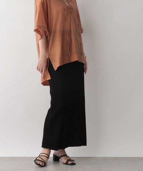 ■素材特性■ シンプルなニットスカートですが、ヘンケイリブが今年らしいタイトスカートです。 綿素材でリブ目が立っている表面感なので細見えしスタイル良く見えるようになっています。 ■デザイン■ スリットの位置を前や後ろにずらして着用し印象を変えることも可能なデザインとなっています。 リブが立っているので身体のラインをひろいすぎず1枚でも着用しやすくなっています。 ■スタイリング例■ 夏らしいレースシャツや開襟シャツとの合わせがトレンド感もありオススメのスタイリングです。 トングサンダルなどのサンダルと合わせるとより夏らしい雰囲気になり〇