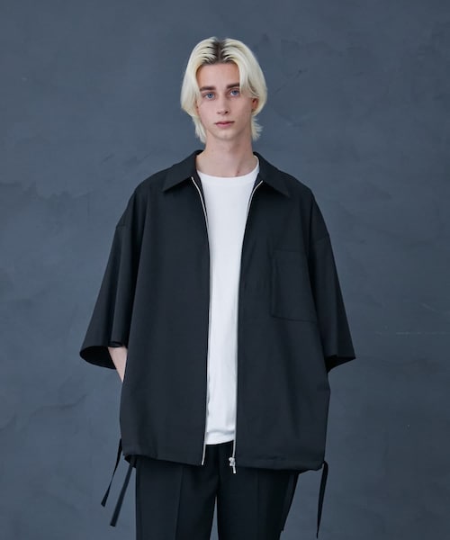 デザイン毛羽が少なくクリアな表面感が特徴の生地を使用し高級感を与え、シャツにして大ぶりなジップを使用し重厚感を持たせました。サイドスリットとウエストコードでシルエットの変化や、バックスタイルの切り替え生地のほつれで経年変化を楽しむデザインとなっています。素材"ELEPHAR"…エレガントさとリラックス感を両立した快適な素材。最高級の紡績技術と60/2のサイロスパン紡績糸を使用し、毛羽が少なくクリアな表面感を実現。 また、仕上げで蒸気をあてながらじっくりセットすることで生地が縦横に追い込まれ、適度なハリコシ