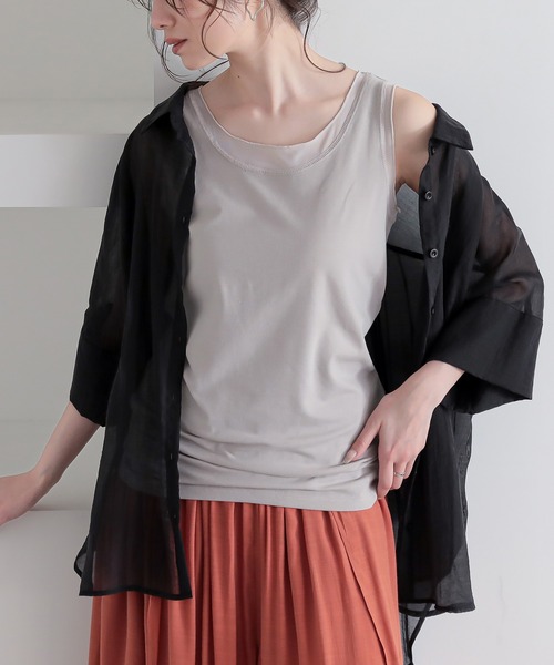 『フツウじゃ物足りない。』モードな雰囲気放つ、センスに差のつくタンクトップ。襟ぐりとアームホールをシアーメッシュ素材で切り替えた重ね着風デザイン。切り替え部分にはデザインステッチを施してひとクセ効かせたアクセントをプラスしました。インナーに響かないよう切替位置にもこだわり、一枚で着ても羽織と合わせてもサマになる一着です。さらに、選べるM~3Lサイズ展開も嬉しいポイントです。ラフに"旬な肌見せ"を纏う≪n'OrLABEL≫シアーメッシュ切替タンクトップです。