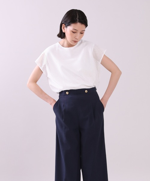 カットソーのような軽い着心地が嬉しいレースブラウスは、エレガントかつスポーティなスクエア柄がポイント。素材や柄を楽しんでいただけるようデザインはシンプルにし、袖の透け感とフレンチスリーブで女性らしさをプラスします。モノトーンでボトムのカラーを選ばず、ON・OFF両方の着こなしに使えるブラウスは一枚は持っていたいアイテムです。 ・裏あり ・後ろボタンあり ・水洗い可 *************** 伸縮性:無し 透け感:ホワイトのみ有り 生地の厚さ:薄い *************** レビュー STAFF.Y・W (年齢:30代/身長:160cm/普段の着用サイズ:9号・トップス9号・ボトム9号・アウター9号) 着用カラー:ホワイト 裏地付きなのでインナーが透けにくいです。ヒップにかかる着丈なので、タックインしなくてもバランス良く着用できました。
