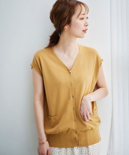 カーデとしてもプルオーバーとしてもスタイリングが出来るフレンチスリーブのニットカーディガン。 素材はドライタッチなコットン100。 表面をガス焼き加工しており毛羽の少ない綺麗な表面感とコットンのナチュラル感の両方のニュアンスがあり夏らしいアイテムです。 フロントのゴールドの釦とポケットがアクセントに。 フレンチスリーブで程良く二の腕にかかるので腕を華奢見えさせてくれます。 夏らしい色展開で多色買いもお勧めです。