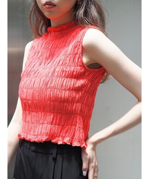 シャーリングが特徴的な生地を使用した、ボトルネックのトップスです。首元の後ろにリボンを付けています。タイトめなシルエットなので、ハイウエストボトムやボリューム感のあるボトムとの相性抜群です。
