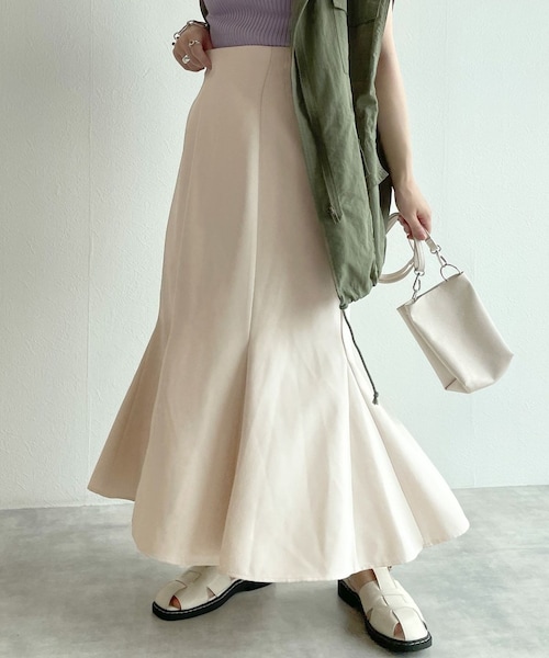 定番のマーメイドスカートベーシックカラーのマーメイドスカートが新登場。後ろゴムのウエストでストレスフリーに。裾広がりのマーメイドデザインで女性らしいきれいなシルエットを実現。しわになりにくい素材になっているので、普段のコーデにも取り入れやすいマストハブアイテムです。スタイリング合わせるアイテムによってキレイめにもカジュアルにも着こなせる万能アイテム。抜け感のある無地Tなどと合わせた大人カジュアルコーデや、シアーシャツをはおって、レディライクなスタイリングに◎。合わせるアイテムを迷わず使えるオススメのアイテムです。※商品の色はimageの着用写真ではなく、商品写真をご参照ください。--------------------裏地:アイボリー膝上まであり透け感:なし厚さ:普通伸縮性:なし--------------------