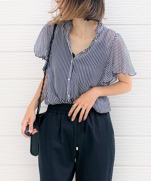 【一部店舗限定商品】ストライプが目を惹くシアーブラウスの登場です。スタンドフリルの襟が女性らしさと、きちんと感を演出。長さもミドル丈で、インでもアウトでも着やすい着丈にしました。お仕事着としてはもちろん、カジュアルにコーディネートして普段着として着ていただくのもおすすめ。サラッとした肌触りと取扱いやすい素材が、これから夏のシーズンに大活躍しそうです。《インフォメーション》◆商品のお気に入り登録完売していても再入荷時に再入荷通知を受け取ることができますので、是非ご登録ください。◆ブランドのお気に入り登録新商品や再入荷などの情報を受け取ることができますので、是非ご登録ください。