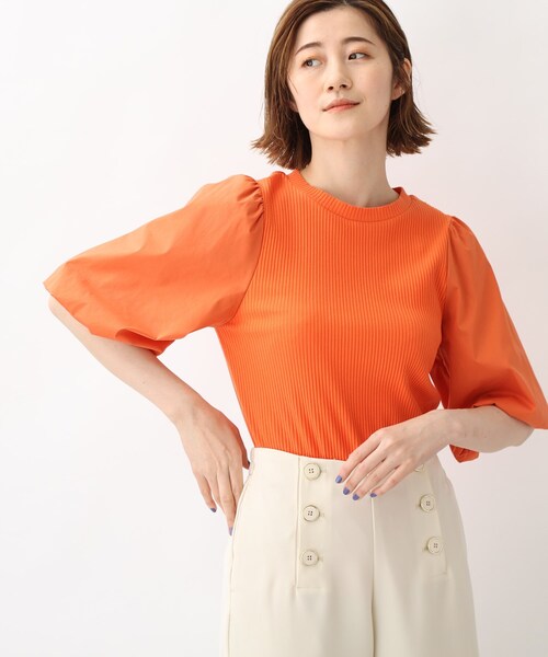【デザイン/シルエット】 1枚で華やか見えするバルーンスリーブのプルオーバー。 袖の中に裏地をつけて、表地を吊ることでボリュームを出しています。 身頃にはテレコジャージ、袖にシャツ地を使用しており素材の対比が洒落見えする1枚です。 すっきりとしたシルエットの為、ボリュームのあるスカートやワイドパンツとのスタイリングがおすすめです。 ウエストをインした時にごろつきにくいのもポイントです。 【素材】 身頃部分はコットン混の肌当たりが良いテレコジャージ、袖部分はポリエステル混のシャツ素材を使用しています。 ***************************** 【お買い物をよりお楽しみいただくために♪】 \\気になるアイテムはお気に入り登録がおすすめ!// ◆オンラインサイトの商品ページにある 『 マーク』をクリックして簡単に追加できます。 再入荷通知や値下げ情報、在庫状況をメルマガにてお知らせ! マイページにてお気に入り一覧もチェックできます!! ***************************** モデル情報:身長166cm B80 W59 H86 着用サイズ:02(M) 店舗へのお問い合わせ商品番号:768-15311 ●製品寸法: 01(S):着丈58cm B78cm 袖丈33cm 肩幅30cm アームホール23cm 02(M):着丈60cm B81cm 袖丈33cm 肩幅31cm アームホール24cm 03(L):着丈62cm B84cm 袖丈34cm 肩幅32cm アームホール25cm 04(LL):着丈64cm B87cm 袖丈34cm 肩幅33cm アームホール26cm 05(3L):着丈66cm B90cm 袖丈34cm 肩幅34cm アームホール27cm 備考: