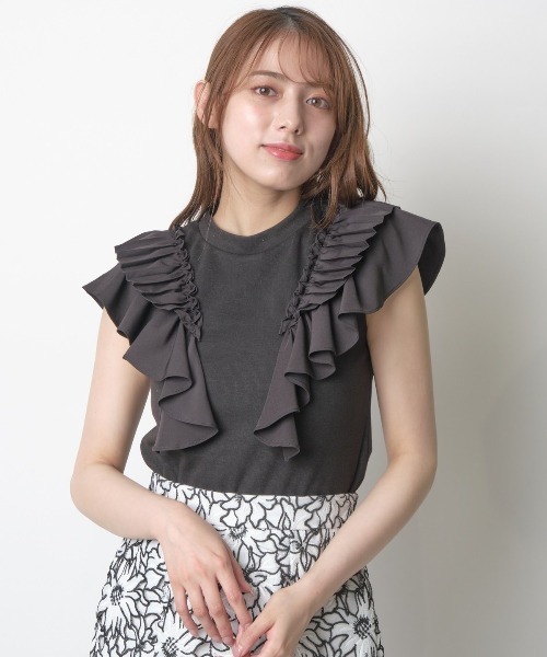 顔周りを華やかに女性らしさを引き立てるトップス 【Design】 ・ショルダー部分のラッフルが目を引くトップス。 ・プリーツとラッフルを重ねたデザインが顔周りを華やかに引き立てます。 ・ボディ部分はカット素材となっておりソフトな肌触りが心地よく着心地も抜群◎ ・クルーネックなので首回りもすっきり。 ・ボトムを選ばず、さまざまなシーンでお使いいただけます。 【Fabric】 ・程よい厚みのあるシワになりにくいポリエステルの混紡素材を使用。 ・ご自宅でお手入れが出来るので、汗ばむ季節でも安心してお召いただけます。 ・どんなカラーにも合わせやすいオフホワイト、ピンク、ブラックの3色展開となります。 【Care】 手洗い可能 M:(02):着丈51㎝/身幅40㎝/肩幅33㎝