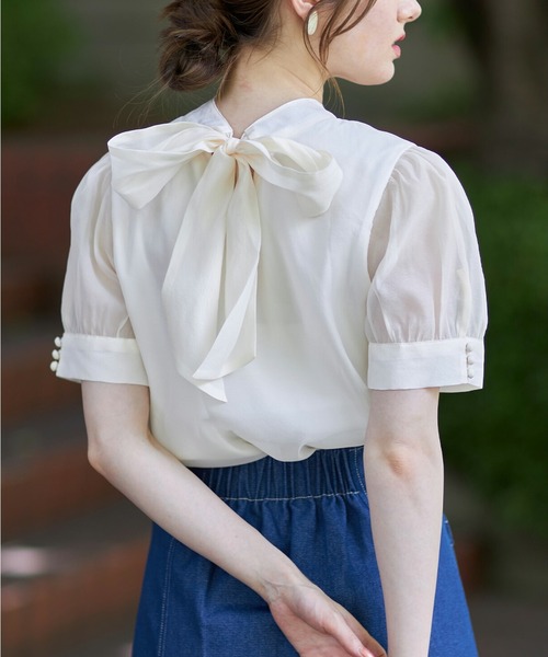レディコーデに欠かせないボウタイリボンデザインにトレンド感をのせた旬顔ブラウス。シーズンライクな透け感を楽しめるシアー生地でほんのりヘルシーな肌見せが可能に◎スマートなギャザー入りのスタンドカラーとふんわり仕上げた今っぽい可愛さのスリーブできちんと感と愛らしさを演出してくれます。前後2WAY仕様なので、後ろ姿で魅せるバックシャンな着こなしもできます♪