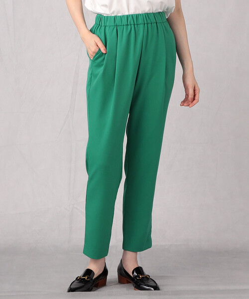 テーパードシルエットの、ストレッチカラーパンツ。やわらかく、膨らみ感のあるストレッチ入りの二重織組織の素材を使用し、シワになりにくく、膝が出にくい、きれいめな素材。素材のストレッチ性があり、着心地の良さが特徴です。また、ウエストは着脱しやすいゴム仕様で、更にスピンドルでの調整が可能。股下の筒の位置を円側に寄せることで、脚が真っ直ぐきれいに見えるよう、工夫しました。裾に向かって細くなったシルエットは、直線的に作られ、すっきりとした印象。ピンク、ブルー、グリーン、使いやすいブラックの4色展開で、特にカラーの3色はスタイリングのポイントにおすすめです。…………………….…….…….…透け感:なし厚さ:ふつう伸縮性:あり光沢感:なし裏地:なしポケット:あり洗濯方法 洗濯機洗い…………………………..…….…※画像の商品はサンプルとなりますので実際の商品と仕様、加工、サイズが若干異なる場合がございます。※こちらの商品はFIVE FOXes独自の採寸方法となっています。本サイトのサイズガイドと採寸方法が異なる場合がありますのでご了承ください。