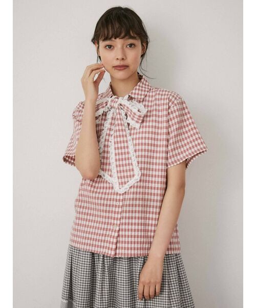 大人気なボウタイブラウスがギンガムチェックになりdebut!タイリボンに挟み込んだレースがアクセントになり、ぐっと可愛らしく。表情のある素材を使用しているので、しわになりにくくお手入れもしやすいうれしい1枚です。ミニボトムやティアードスカート合わせはもちろん、キャミワンピースのレイヤードにもおすすめです。