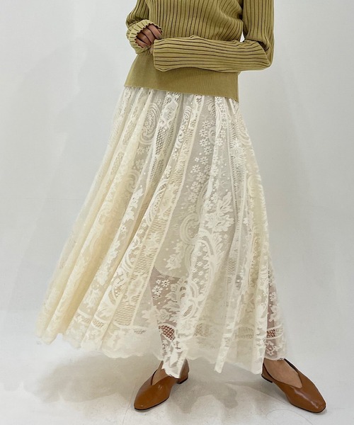 ヴィンテージ調のフラワーレースを贅沢に使ったフレアスカート。 Tシャツ、ブラウスやニットまでトップスを選ばず、シーズンレスに活躍します。 ■point ・ヴィンテージ調の甘くなりすぎないレースを使用 ・ウエストゴムですっきりらくちん ・シーズンレスで、秋冬はタイツやブーツとも相性◎ ■detail サーキュラー仕様で、歩くとふんわり揺れるフレアボリューム。 ウエストはゴム仕様で、すっきりと見えてらくちん。 ■fabric Tシャツ、ニットやブラウスなどどんなトップスにも合わせやすいのでシーズンレスに重宝します。 –––––––––––––––––– 透け感:あり(アイボリー) 厚さ:薄手 伸縮性:なし 裏地:あり ポケット:なし 洗濯方法:手洗い可 –––––––––––––––––– ※取り扱いは、商品についている品質表示をご確認ください。 ■商品に関する注意事項 ※商品画像はサンプルのため、色味やサイズ等の仕様に変更がある場合がございますので、予めご了承ください。 ※照明の関係により、実際よりも色味が違って見える場合があります。 またパソコン・スマートフォンなどの環境により、若干製品と画像のカラーが異なる場合もございます。予めご了承ください。