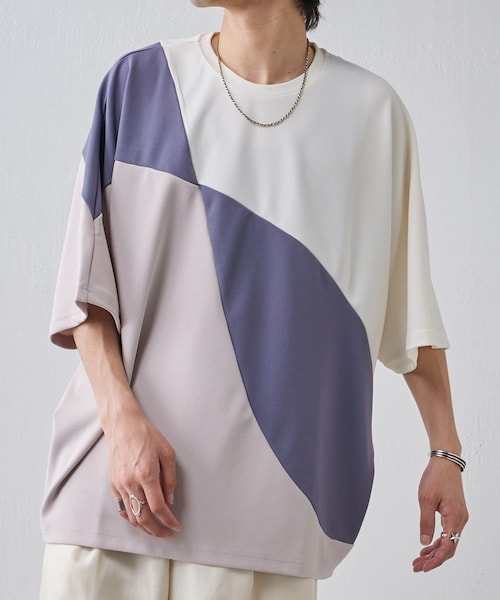 Lui's(ルイス)22SSより、ユニークな配色切り替えの、配色パターン切替カットソーの登場です。他には無いパターンに拘ったデザインカットソーです。【素材】素材には、表面感のキレイなジョーゼット素材を使用。表面は梨の様な凹凸のある表情豊かな素材感で、内側はサラッとした気持ちの良い素材感です。ストレッチ性もあるので、ストレスレスに着て頂けます。【デザイン】ドルマンスリーブのややオーバーサイズのカットソー。斜めにクロスした2つのライン。4分割されたパネルを斜めに配色切替しているユニークなデザイン。身幅が広め取られているのに対して、丈はレギュラーなサイズ感。袖丈は5~6部袖ぐらいの半端袖となっております。【コーディネート】デザイン性のあるカットソーなので一枚で着て頂くのはもちろん、シャツのインナーとして着て頂くのもオススメです。また今季は、この夏展開しております、メッシュTシャツや、レースTシャツを組み合わせたレイヤードスタイルを楽しんで頂くのもオススメ。キレイめからカジュアルなスタイルまで幅広くお使い頂けるカットソーです。※掲載商品の商品の色味は、屋内の光の照射や角度により実物とは色味が異なることがございます予めご了承ください。【サイズ】着丈 : 69cm胸囲: 144cm総丈 : 71cmゆき : 55cm
