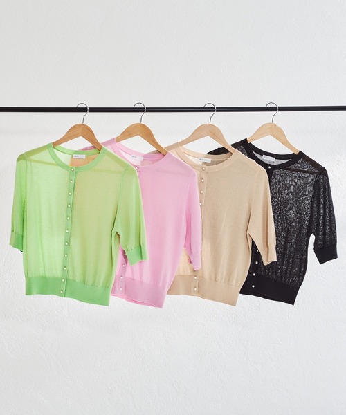 小さめのパールボタンが可愛く爽やかなシアーカーディガン。コンパクトなサイズ感でボトムとも相性が良く、トップスとしてもカーディガンとしても使える万能アイテム。 5分丈でさらっと涼しげな素材のためキャミワンピースやタンクトップなどにさっと羽織ったり肩掛けしたりと着回し力抜群。 しわになりにくいので冷房対策の持ち歩きや夏の日焼け対策にも◎。 オフィスカジュアルやオケージョンシーンにもオススメ。 ★《お気に入り登録》でお得な情報をGET★ ・「商品のお気に入り登録」で再入荷通知やラスト1の通知、セールやクーポンの通知も受け取ることができます!→ハートマークをクリック ・「ブランドのお気に入り登録」で新商品や再入荷など、お得な情報を受け取ることができます!