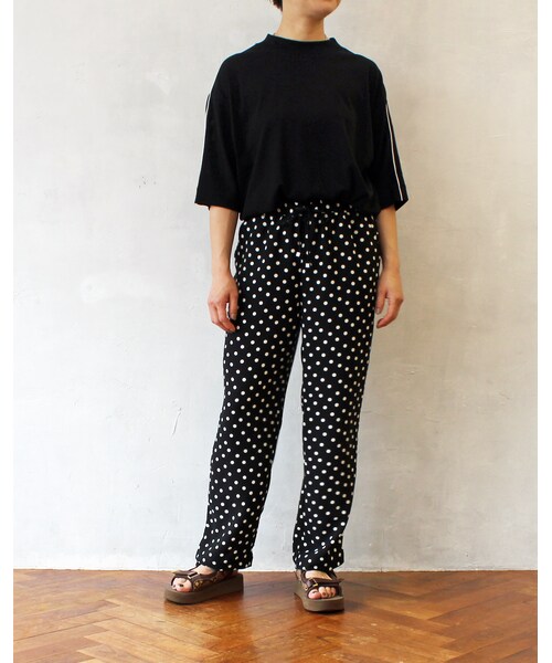 『マイノリティファン』のオリジナルブランド『L'Ancre(アンカー)』の秋冬シーズン第一弾の新作です! ケーブルジャガードイージーパンツがかなり好評で、同じ形でドット柄のサラサラなジョーゼットでイメージ一新! 落ち感のあるジョーゼット生地は、シルエットのキレイなパンツに仕上がりました。 真夏にTシャツとも、秋になったらニットとのい素材感を楽しめます。 何より、定番的に着こなし続けられそうなドット柄もイイ! minoriTY-funにしかない、『L’Ancre』は日常着であるとともに、大人のカラダをバランス良く見せるシルエットと、ちょっと気の利いたデザインでお洒落ゴコロをくすぐる服を作ります。 (着用モデル身長:163cm)