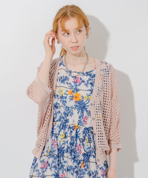 ざっくりとしたメッシュ編みが涼しげなカーディガンが入荷しました。○POINT・ざっくり編みのメッシュデザインがコーディネートの全体の旬度をグッと高めます。・貝殻釦がさり気なく季節感を演出。・コンパクトなボレロ丈と七分袖で、ビッグサイズやオーバーシルエットが苦手な方にもおすすめです。○STYLING・コンパクトなシルエットなので、ワンピースやボリュームのあるボトムスとも好相性です。・花柄ワンピースとヒールサンダルに羽織れば、お出掛けフェミニンスタイルに。裏地:なし光沢:なし伸縮性:なし透け感:あり生地の厚さ:薄手ポケット:なし