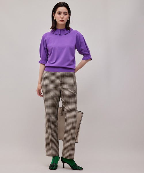【素材】 ストレッチ性と独特な表面感のあるドライタッチのヴィスコースポリエステル糸を使用しています。糸を作る過程で有害な化学物質を使用していないという世界認証を取得している、環境にも人体にも配慮した素材です。 【デザイン・シルエット】 畦フリルがポイントのプルオーバー。見頃と同じ糸でフリルを作れるのはニットならではのテクニック。袖に程よいボリュームを持たせてモードな雰囲気に仕上げた、コーディネートの主役になれるニットです。 【カラー】 秋を感じさせるシックなカラー展開。 【おすすめのスタイリング】 Aラインやギャザースカートなどボリュームのあるスカートや、デニムとのカジュアルアップスタイリング、ジャンパースカートのインナーとしてのスタイリングがオススメです。 ---------------------------- 透け感:なし 裏地:なし 伸縮性:あり 光沢感:なし 生地の厚さ:薄手 ポケット:なし 洗濯方法:手洗い中性 ---------------------------- 【モデル情報】 モデル身長:168cm着用サイズ:38 ※画像の商品はサンプルです。 実際の商品と仕様、加工、サイズが異なる場合がございます。 ※撮影場所やライティング、お使いのモニター環境によって色の見え方が異なる場合がございます。 ※商品のカラーは画像の色味をご参照ください。動画は仕様説明のため、色味が実物と異なる場合がございます。