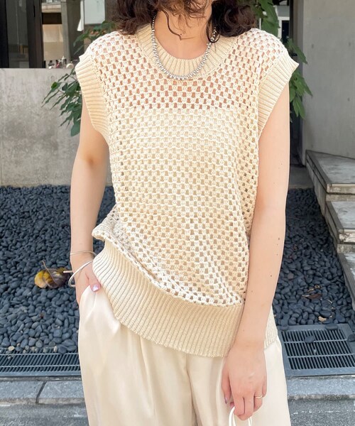 着回し抜群!立体感のある編地のメッシュベストが登場!商品ポイント・1枚でもレイヤードスタイルにも決まるメッシュデザインのベストが登場!・抜け感が今季らしいムードのある印象に。・キャミソールに合わせてもチクチクしない柔らかな素材感。・夏のスタイリングに取り入れたいプラスワンアイテム◎スタイリングポイント・パット付インナーを合わせて1枚でスタイリングの主役に!・ワンピースやオールインワンにレイヤードして頂くのも◎着用コメント身長:162㎝ 骨格:ストレート抜け感のあるメッシュデザインが夏でも重すぎずすっきりとした印象に決まります!ハイウエストボトムに合わせて前をインしてスタイルアップに着るのがオススメ◎身長:157㎝ 骨格:ウェーブ気になる腰回りもカバーしやすい丈感です!ノースリーブデザインのワンピースにレイヤードしてこなれ見えスタイルに◎骨格タイプ'ストレート:全体的に立体型で筋肉質。ひざ下はすらっと細め。ボディラインにメリハリがある。ウェーブ:上半身が薄く、華奢。緩やかな曲線のボディライン。下半身に重心があり女性らしい体型。ナチュラル:筋肉や脂肪があまり感じられない体型。腰の位置が高く骨や関節が目立ちやすい。'※洗濯、取り扱い洗濯:40度限度 手洗いアイロン:低温110℃まで スチームなし(あて布使用)タンブル乾燥:不可------------------------------------------------------裏地:なし伸縮性:あり光沢感:ややあり生地の厚さ:普通------------------------------------------------------------------------------------------------------------商品のお気に入り登録➡ お気に入りアイテムの値下げ・再入荷・在庫1点などの通知を受け取ることができます。ブランドのお気に入り登録➡ 新商品や再入荷、セール、クーポン配布などお得な情報を受け取ることができます。※サイト上のカラー名と、お届け商品に記載されているカラー名が異なる場合がございます。※商品の色味は、撮影場所や光のあたり具合などにより色味が違って見える場合が御座います 。また、お客様のお使いのPCのモニター環境などにより色味が違って見える場合が御座います。予めご了承の上ご注文下さい。※ご注文いただいた予約商品のお届け時期の確認は、注文履歴ページより行えます。------------------------------------------------------'