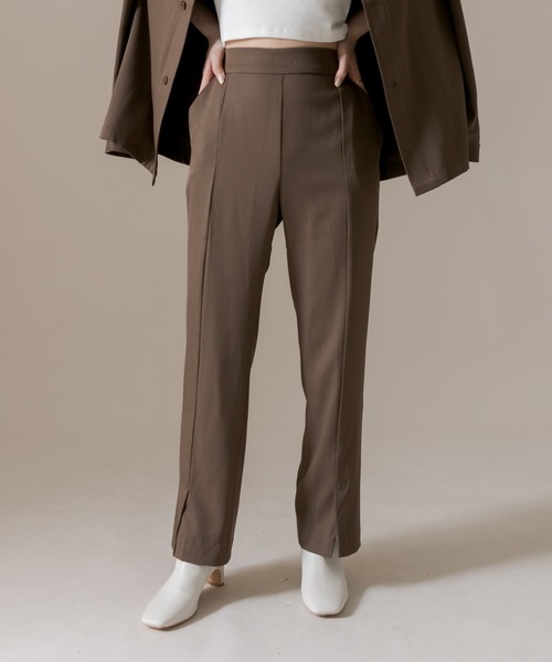 ※セットアップ対象のシャツジャケットは以下品番よりご購入いただけます。MYZ1022104A0001フロントのスリットがコーディネートに抜け感と軽やかさを演出!商品ポイント・美脚効果抜群なセンターラインとスリットがポイント!・オンオフ選ばないマルチに使えるテーパードデザイン・嬉しいポケット付きと2サイズ展開・深みのあるカラー展開もポイントです!スタイリングポイント・インスタイル、アウトスタイルどちらも決まりやすいデザイン・同生地のシャツジャケットと合わせてセットアップ風にお使いいただけます!スタッフ着用コメント〇153cmスタッフ サイズ:1 カラー:GRYオンオフスタイルが叶いやすいGRY、残暑が残る時期はTシャツやシアーシャツなどと合わせても◎センターラインとスリットがすらっと見せてくれるので低身長でも挑戦しやすいデザインですまたバックはゴム仕様に仕様になっているため着脱もしやすいです〇158cmスタッフ サイズ:1 カラー:OLV絶妙なアースカラーのOLVはオシャレ見えNO1カラー!!白Tやシャツ合わせでメンズライクなスタイルコーデが完成。同生地であるシャツジャケットと合わせてトレンドのセットアップコーデに!!〇165cmスタッフ サイズ:2 カラー:GRNスッキリとしたシルエットのパンツはオーバーサイズのニットなどと合わせて腰回りをカバー!メリハリのついたコーディネートが叶います!※洗濯、取り扱い洗濯:40度限度 手洗いアイロン:低温110℃まで スチームなし(あて布使用)タンブル乾燥:不可------------------------------------------------------裏地:なし伸縮性:なし光沢感:あり生地の厚さ:ふつう------------------------------------------------------------------------------------------------------------商品のお気に入り登録➡ お気に入りアイテムの値下げ・再入荷・在庫1点などの通知を受け取ることができます。ブランドのお気に入り登録➡ 新商品や再入荷、セール、クーポン配布などお得な情報を受け取ることができます。※サイト上のカラー名と、お届け商品に記載されているカラー名が異なる場合がございます。※商品の色味は、撮影場所や光のあたり具合などにより色味が違って見える場合が御座います 。また、お客様のお使いのPCのモニター環境などにより色味が違って見える場合が御座います。予めご了承の上ご注文下さい。※ご注文いただいた予約商品のお届け時期の確認は、注文履歴ページより行えます。------------------------------------------------------ "
