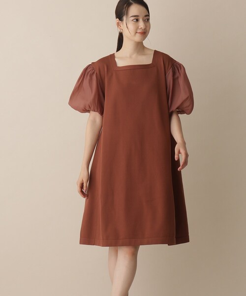 袖異素材のスクエアネックデザインニットワンピース。 【素材】 ポリエステルのスポンジヤーンをつかった、ハリ感とぎゅっとした糸感が特徴的な素材を使用しています。 程よく表面をきれいにみせてくれる糸感で、ボリュームを出しても軽やかな仕上がりが特徴です。 袖部分は程よいハリ感と透け感のある布帛素材で、ボリュームのあるデザインを演出。 ※裏地なし ※グレー(012)はやや透け感があるため、インナーの着用をおすすめします。 【シルエット】 Aラインのふんわりとした華やかなミニ丈ワンピース。 袖を程よいハリ感と透け感のある布帛素材でふんわりとしたボリューム感を演出したデザインに。 少し短めの丈のワンピースなので、かわいらしさを重視したボリューム感のあるシルエットに仕上げました。 ※ポケットなし 【こだわり】 今年トレンドのミディ丈ワンピースを短すぎず、着用しやすいデザインにおとしこみました。 袖のボリューム感とAラインのフレア感が全体的にかわいいシルエット。 マシンウォッシャブル機能つき。 こちらの商品は主に夏に着用いただける商品です。 モデル情報:身長166cm B80 W58 H83 着用サイズ:38(M) 店舗へのお問い合わせ商品番号:N02-54023 ●製品寸法: 38(M):着丈97cm B112cm 袖丈24cm 肩幅45cm W130cm H148cm 備考: