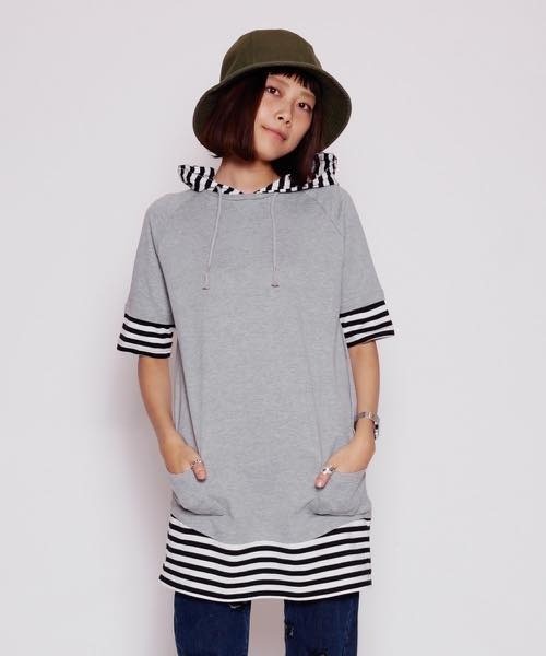 シンプルな無地とボーダーで仕上げたボーダーフードTEE。ボーダーのインナーをレイヤードさせたかのような遊び心あるひと品。柔らかな肌触りでリラックスして快適に着用頂けます。※実際の商品と仕様、加工、サイズが若干異なる場合がございます。