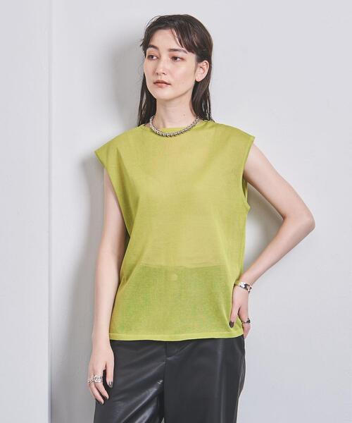 シアー素材がトレンド感のあるノースリーブニット ■デザイン 腕のラインがきれいに見えるフレンチスリーブ。 透け感のある編み地でお作りしているのでインナー次第で表情が変えられ、レイヤードを楽しめる一着です。 ■素材 程よいハリと艶のあるレーヨンとナイロンの混合糸を使用。 ■コーディネート デニムパンツなどカジュアルなボトムとのスタイリングや、キャミソールワンピースにレイヤードしたりと、汎用性が高く着回しの効くアイテムです。 ============================ 裏地:なし 透け感:あり 光沢感:なし ケア方法:ドライクリーニング ============================ 【注意事項】 ※商品を使用前に、タグ等に記載されている「取り扱い上の注意書き」、「洗濯表示」を必ずご確認ください。 ※商品画像は、光の当たり具合やパソコンなどの閲覧環境により、実際の色味と異なって見える場合がございます。予めご了承ください。 ※商品の色味の目安は、商品単体の画像をご参照ください。 店舗へお問い合わせの際は、全国のUNITED ARROWS各店舗まで下記の品名/品番をお申し付け下さい。 品名:UWSC SHEER FRNCH 品番:15186991573