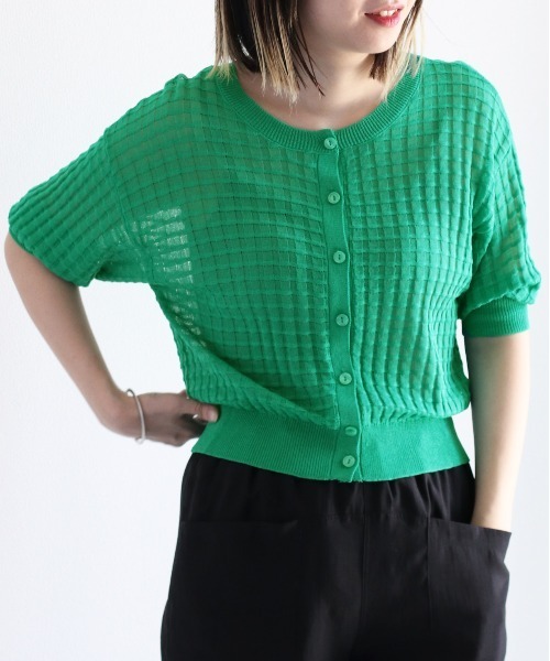 シンプルだけど存在感のあるシアーカーデ◇Point◇チェック見えする編地のカーディガン。シンプルなおつくりですが、コーデの主役になるアイテムです。ほんのりシアーな生地感が今年らしい。◇Material◇透け感のある生地で、さらりとした肌当たりです。腰あたりの丈感で、短すぎないけどすっきり着られる仕様になっています。ドライクリーニング処理が可能です。◇Coordinate◇編地が特徴的なので、無地のボトムがおすすめ。スカートにもパンツにも合わせていただきやすいデザインです。ワンピースに羽織ったり、デザイン性のあるキャミソールやタンクトップと合わせるのもGOOD!※照明や天候により実際の色味と異なって見える場合がございます。ご了承くださいませ。