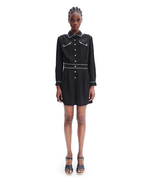 Jessica Ogdenとのインタラクション. ポルカドットのレーヨン. ワイドカット. 後身ウエストにゴム入り. 衿、憲章、胸ポケット、袖口、ウエストシームにバイアストリミング. 小さなプリーツ入りバックヨーク. 上下にプリーツが入ったウエストの切り替え. 貝ボタン.