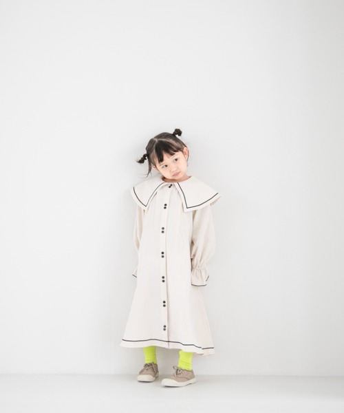 大きな襟がポイントのワンピース。ナチュラルな風合いの素材をモノトーンカラーにする事で、素朴だけどちょっぴりクールな印象に仕上げました。 配色のステッチも効いていてポイントに! 2個ずつ付いたボタンもアクセントになっていて、 1枚でお洒落に決まるアイテムです!