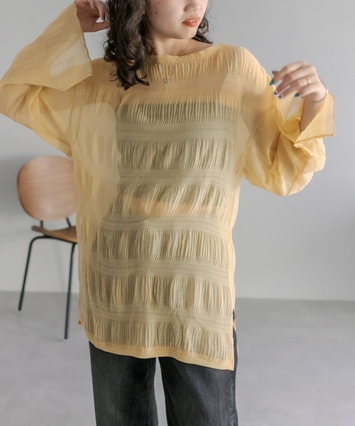 表情のある楊柳素材のブラウスが登場! 商品ポイント ・トレンドのシアーな程よい透け感と表情のある楊柳素材を使用したブラウス。 ・さらっと滑らかな素材で肌触りも抜群◎ ・袖口はゴム仕様となっており、すっきり止めてくれます。 ・長めの丈感で気になる腰回りもカバーしてくれます! スタイリングポイント ・ミニボトムに合わせてワンピース風に◎足元はロングブーツ合わせがオススメ◎ ・ハイウエストデニムにインしてすっきりとしたコーディネートにも! ※洗濯、取り扱い 洗濯:30度限度 洗濯機「弱」 アイロン:低温110℃まで スチームなし(あて布使用) タンブル乾燥:不可 ------------------------------------------------------ 裏地:なし 伸縮性:なし 光沢感:なし 生地の厚さ:普通 ------------------------------------------------------ ------------------------------------------------------ 商品のお気に入り登録➡ お気に入りアイテムの値下げ・再入荷・在庫1点などの通知を受け取ることができます。 ブランドのお気に入り登録➡ 新商品や再入荷、セール、クーポン配布などお得な情報を受け取ることができます。 ※サイト上のカラー名と、お届け商品に記載されているカラー名が異なる場合がございます。 ※商品の色味は、撮影場所や光のあたり具合などにより色味が違って見える場合が御座います 。 また、お客様のお使いのPCのモニター環境などにより色味が違って見える場合が御座います。予めご了承の上ご注文下さい。 ※ご注文いただいた予約商品のお届け時期の確認は、注文履歴ページより行えます。 ------------------------------------------------------"