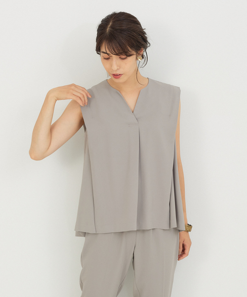 袖のタックがポイントのノースリーブブラウス。さらっとした肌触りで、汗をかいても肌にはりつきにくく心地よい着心地です。 同素材のパンツやジャケットとセットアップで着られるので、お仕事用としてもおすすめです。
