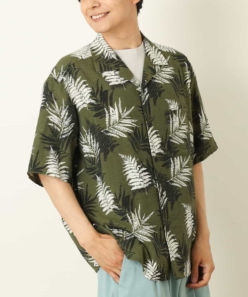 ◆リーフ柄プリントを施したワイドシルエットシャツ◆【デザイン】トレンドのリーフ柄を使用したオープンカラー(開襟)シャツ。大きいリーフ柄がリゾート感あふれるアロハシャツ。身幅にゆとりのあるワイドシルエットで、羽織るだけで大人のリラックススタイルになる夏にぴったりの一枚です。袖丈はひじが隠れる程度の5分袖にしているので、トレンド性の高いシルエットで夏服にオススメです。【素材】レーヨンナイロン素材のため、軽くサラッとした肌触りがポイント。接触冷感機能付きで真夏に1枚で着てもひんやり涼しく着用できます。イージーケア機能も付いており洗濯後のお手入れも簡単です。【スタイリング】シャツハオリとしてシンプルに無地カットソーやロゴTとあわせたり、ロングシルエットカットソーとの裾レイヤードスタイルでトレンドの着こなしができる汎用性の高いアイテムです。ボトムはきれい目スタイルであればスラックス合わせ、カジュアルスタイルであればゆとりのあるパンツとあわせるとバランスが良いコーディネートができます。----------------透け感:ややあり裏地:なし伸縮性:なし光沢感:なし生地の厚さ:やや薄手----------------※お使いの液晶環境により、色味が多少異なる場合がございます。予めご了承ください。※サンプルにて撮影しておりますため、お届けの商品と仕様が若干異なる場合がございます。予めご了承ください。