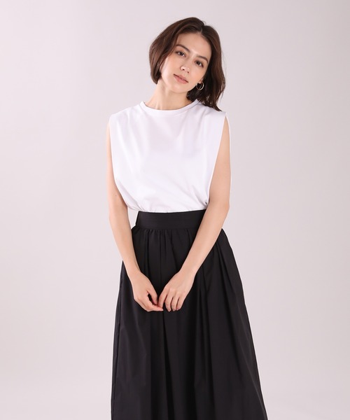 リラックスムードたっぷりに仕上げたスリーブレスカットソー。肩に自然にかかるタックのバランスを計算し、腕まわりをグッと引き締めて見せるシルエットにこだわりました。なめらかなタッチとストレッチ性が特徴のジャジー生地を使用し、身体に吸い付くことのないストレスフリーな着心地も嬉しいポイントです。定番のモノトーンカラーにコンパクトシルエットでカーディガンやジャケットも羽織りやすく、インナー使いにもおすすめのアイテムです。・水洗い可***************伸縮性:有り透け感:オフホワイト有り生地の厚さ:普通***************レビューSTAFF.A・M(年齢:40代/身長:170cm/普段の着用サイズ:9号・トップス9号・ボトム9号・アウター9号)着用カラー:ブラック腕をあげても中が見えないので一枚で着られます。張り感があるツルっとした生地で、インしてもシワになりにくいです。