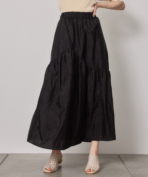 大人可愛いが叶うボリュームスカート【甘くなり過ぎないデザイン】スポーティーさも感じる素材で、軽やかかつ程よくカジュアルに。ウェーブを描いたカーブも、大人っぽくモードな印象にしてくれます。■デザインカーブの切り替えとシャカシャカした素材で甘さを抑え、大人っぽく履けるギャザースカート。たっぷりのボリューム感がありながらも、ウエスト/ヒップ周りはすっきり見える計算されつくしたこだわりのデザイン。 裏地付きで透けにくく、シーズンレスで着回せるアイテムです。夏はコンパクトなトップスと合わせるのがおすすめです。■素材表面感があるナイロン素材を使用しました。光沢感のあるブライト糸を使用することで、通常のナイロン素材よりも女性らしい印象に。ソフトなのに適度なハリ感があるので、シルエットを美しく保ちながら着心地も抜群。マキシ丈でも重さを感じさせないので、オールシーズン着用可能です。■お手入れ方法洗濯機での洗濯が可能です--------------------------------------------裏地:あり(ポリエステル100%)光沢感:あり透け感:なし伸縮性:なし厚さ:普通--------------------------------------------