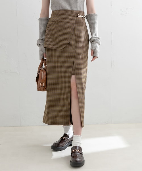 デザイン性豊かな秋見えレイヤードスカート■デザイン・トレンド感のあるラップ風デザイン。・深めのスリットデザインで肌見せ&縦ラインが強調され美シルエットに。・サイドにはビットをあしらいクラシカルに仕上げました。・すとんとしたIラインシルエットが大人レディーな1枚です。■カラー・ブラウン(チェック柄)/チャコール(無地)/ブラック(無地)の3色展開■スタイリング・ブラウスなどの甘めアイテムで合わせたり、秋はニットとのスタイリングもおすすめです。・足元はボリュームのあるブーツや、ローファーでプレッピーに合わせたりとアイテムによって雰囲気の違いを楽しめます。-----------------------------裏地:あり光沢感:なし透け感:なし伸縮性:なし-----------------------------model:166cm お取り扱い上の注意※キャンペーンやフェアにより価格が変動する場合がございます。※サンプルで撮影している為、実際の商品と若干仕様が異なる場合がございます。※着用、お取り扱いの際は、商品についている品質表示とアテンションタグを必ずご確認下さい。※ご覧のモニター環境や撮影環境により実際の商品と多少色味が異なって見える場合がございます。ご理解の程よろしくお願いいたします。≪返品・交換について≫・着用後、洗濯後の返品・交換は致しかねます。・商品到着後、着用前に商品状態のご確認をお願い致します。登録のおすすめ【気になるアイテムをお気に入り登録】・お気に入り登録した商品はメニューの「♡お気に入り」ボタンから、一覧表示することが出来ます。・完売商品の再入荷やラスト1点の通知、セールの通知を受け取ることが出来ます。パソコン(iPad)の場合・・・「カートに入れる」ボタン横に表示されている「♡」をクリックしてください。スマートフォンの場合・・・商品画像右上に表示されている「♡」をタップしてください。【PALCLOSETアプリのブランドフォロー】・新商品やお得な情報をいち早くcheckする事が出来ます。・スタッフのコーディネートをお楽しみ頂けます。