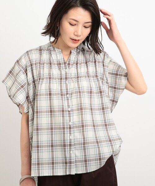 【デザインポイント】 今年らしいシャーリングデザインが入ったチェックシャツブラウス! シャーリングが特徴的なデザインで、こなれ感もありつつスタイルカバーにもなっているオススメな1枚。 首元はスキッパーデザインですっきりとした印象に◎ 少し秋見えするチェック柄でスタイルの雰囲気が変わり鮮度UPするアイテムに仕上がっています。 【生地感】 ポリエステル×コットン(綿)混の扱いやすく、さらっとした着心地の生地感です。 ※こちらの商品はやや透け感があるため、インナーの着用をおすすめします。 モデル情報:身長167cm B78 W62 H88 着用サイズ:02(M) 店舗へのお問い合わせ商品番号:C62-85006 ●製品寸法: 02(M):着丈64cm B132cm 袖丈11cm 肩幅48cm 03(L):着丈66cm B134cm 袖丈11cm 肩幅49cm 備考: