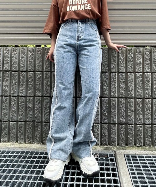センターにフリンジを施した切替デニムパンツ!!センターラインで脚長効果抜群!古着のようなウォッシング加工や裾フリンジデザインがカジュアル感をプラスし、抜け感のあるスタイリングを演出します。《お気に入り登録》・「商品のお気に入り登録」で再入荷通知や、ラスト1点の通知、セール通知も受け取ることができます。・「ブランドのお気に入り登録」で新商品や再入荷など、いち早くブランドのお得な情報を受け取ることができます。【Figments/フィグメンツ】ファッション、音楽、カルチャー。時代とともに変化を楽しむ者たちに向けた、Realityを覆し、常識を壊すユニセックスファッションブランド。