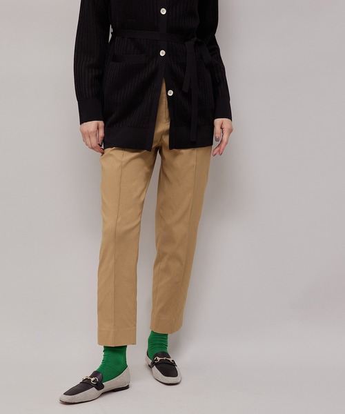 【素材】 春,夏,秋の3シーズン使える万能素材。程よい張り感とキレイメカジュアルな表面感のある素材を使用。特殊な工程で作られたキックバックが抜群のノンストレス素材です。 【デザイン】 ロペの定番のピンタックシガレット美脚シルエットパンツに、オンオフ両方で使いやすい素材と着心地の良さを追求。細身のスッキリとしたシルエットでくるぶし丈で足長効果があり、体のラインを強調しすぎないようにパターンメイキングをした拘りのニューベーシックアイテムです。ウエストが後ろゴムになっており、ヒップ部分にも程よくゆとりがあるため、窮屈さがなくストレスフリーで着用できます。 【カラー】 シックなベーシックカラーと発色の良いビビットカラーの4色展開。 【スタイリング】 単品軸として万能なシンプルで飽きの来ないデザイン。すっきりとキレイ目で着用したいときにはジャストサイズを、少しラフな雰囲気で合わせたいときにはワンサイズ上のサイズをお勧めします。カラーやサイズを変えることで、オンオフ着こなしの幅がぐっと広がります。 ---------------------------- 透け感:なし 裏地:なし 伸縮性:あり 光沢感:なし 生地の厚さ:中間 ポケット:あり 洗濯方法:手洗い ---------------------------- 【モデル情報】 モデル身長:171cm着用サイズ:38 ※画像の商品はサンプルです。 実際の商品と仕様、加工、サイズが異なる場合がございます。 ※撮影場所やライティング、お使いのモニター環境によって色の見え方が異なる場合がございます。 ※商品のカラーは画像の色味をご参照ください。動画は仕様説明のため、色味が実物と異なる場合がございます。