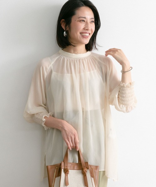 【女性らしい柔らかな質感の、ヨウリュウシアーブラウス】ヨウリュウシアー生地で仕立てた、涼しげなルックスがポイントの一着。スタンドカラーが、程よく上品な印象をプラスします。袖口がギャザーデザインのため、袖を上げるとボリュームスリーブに様変わり◎透け感のある素材のため、レイヤードするインナーの組み合わせも楽しめるお勧めブラウスです。首元のパイピングが印象的なMOCHAと、肌なじみの良いIVORYの2色展開でご用意。[ペチコート]Free : 肩幅28.5cm / 総丈56~62cm / 前身頃47cm / 後身頃49cm / 身幅43.5cm※商品画像は、光の当たり具合やパソコンなどの閲覧環境により、実際の色味と異なって見える場合がございます。予めご了承ください。※商品の色味の目安は、商品単体の画像をご参照ください。▼お気に入り登録のおすすめ▼お気に入り登録商品は、マイページにて現在の価格情報や在庫状況の確認が可能です。お買い物リストの管理に是非ご利用下さい。-----------------------------透け感:あり伸縮性:なし裏地:なし光沢:なしポケット:なし-----------------------------