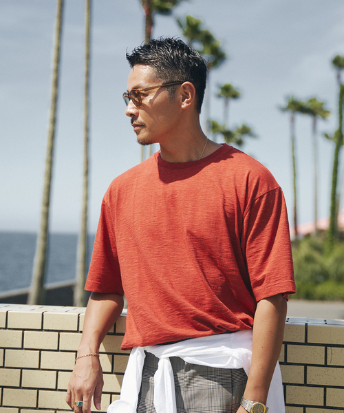 オーガニックコットンを特殊な紡績方法で加工する事で、リネン素材の様にメランジ調に見える素材を使用したTシャツ。 風合いも非常にソフトタッチでリゾートを感じさせられる気持ちのよい素材です。大人の男性が着用して丁度よいスタンダードシルエットで1枚着は勿論、シャツやジャケットインナーとしても相性よく、製品洗いを施す事で自然な仕上がりにしたアイテムです。 ********************** 透け感:なし 裏地:なし 伸縮性:ややあり 光沢感:なし 生地の厚さ:普通 ********************** 【avancer / アボンシェル】 ファッション・インフルエンサーである高田朋佳さん監修のEDIFICEプライベートレーベル。 映画’太陽がいっぱい’を主題にしたカプセルコレクションです。 【ご注意】 ※商品の色味につきまして、お客様のお使いのPCのモニター環境により実際のカラーと画像の色味が違って見える場合が御座います。予めご了承の上、ご注文下さい。 ※店頭・外での撮影画像は光の加減で、実際の商品より明るく見える場合が御座います。商品の色味はスタジオ撮影の画像を参考にして下さい。 モデルサイズ:身長:183cm 着用サイズ:48 本体:洗濯機洗い(弱)