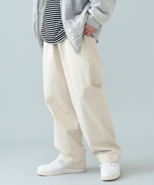 着回しの利くワイド感 ■デザイン ストレッチによりハリが出る為、立体的で綺麗なワイドシルエット。 ■ディテール 高密度に織り上げられ、仕上げにピーチ加工(極細な微起毛)が施されており、コシがありつつ滑らかなパウダータッチの質感が特徴 ■サイズ 腰回りをすっきりさせながら緩やかにテーパードをかけたゆとりのあるサイズ感。 ■素材 オーガニックコットンツイルを使用し、インドの老舗メーカーである<Vardhman(バルドマン)>社のストレッチチノクロスを採用。 Model:H173cm W58kg Size:L 生地の厚さ:やや厚手 透け感:なし 伸縮性:なし 光沢感:なし 裏地:なし 【スタッフレビュー】 スタッフ:Noza 身長:176cm / 普段サイズ:L / 着用サイズ:L サイズ感: ワイドシルエットでベーシックディテールのチノパン。 素材感: 程よい厚みの生地と微起毛の肌触りが心地良いです。 ポイント: ミリタリーチノを彷彿とさせるディテール、ワイドシルエットが最高のチノパン。これはワードローブに是非。 【スタッフレビュー】 スタッフ:浅田 明斗 身長:170cm / 普段サイズ:M / 着用サイズ:S サイズ感: ワイド過ぎないシルエット。ウエストを絞れるので融通が利きます。 素材感: ハリのある素材で綺麗に膨らみます。 ポイント: シルエットが綺麗。ストンと落ちるシルエットでテーパードがきつ過ぎないところが良い。
