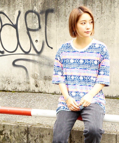 オルテガ総柄が印象的な、存在感◎のTEE。暑い時期にはこれ1枚で、十分に存在感をアピールが可能です。