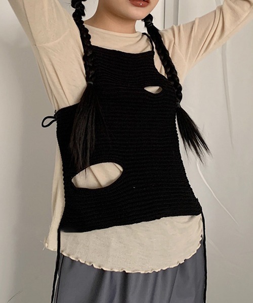 1アイテム取り入れるだけで、コーディネートのポイントになるキャミソールベスト ルーズなニットの風合いと、変形フォルムが遊び心を加えるデザイン。 ラフなムードと不思議なカッティングなど、何通りもの着こなしを可能にさせます。 6か所から出ているヒモによって、どの部分を上にしても着用可能です。 ヒモは、結んだり、垂らしてアクセントを加えるのもおススメの着こなしです。 詳細補足 仕様:サイドの紐で身幅の調整可能 伸縮性:あり 透け感:なし 光沢:なし 裏地:なし 厚さ:薄手 サイズ感:通常 取扱注意事項 ※サイズは、測定方法と測定者によって多少の誤差がありますのでご了承下さいませ。 また体型によって、サイズ感に個人差がございます。(平置き採寸) ※商品によってはシワがつきやすく、畳ジワや折りジワなどが強く出る場合がございます。 その際は加湿した風呂場に数時間干すか、スチームアイロンでのお手入れをお勧めしております。 ※生地の素材上、においが気になる場合がございます。 その際は陰干しして頂くと、ほとんど感じられなくなります。 ※レース等の繊細な素材を使用している場合には、お取り扱いにご注意下さい。 ※お洗濯の際には、洗濯専用ネットをご使用の上、個別での洗濯をお勧め致します。 お色物は、色移りする可能性がございます。 ※着用画像は撮影状況や光によって、多少異なる場合がございますので、置き画像をご確認下さい。