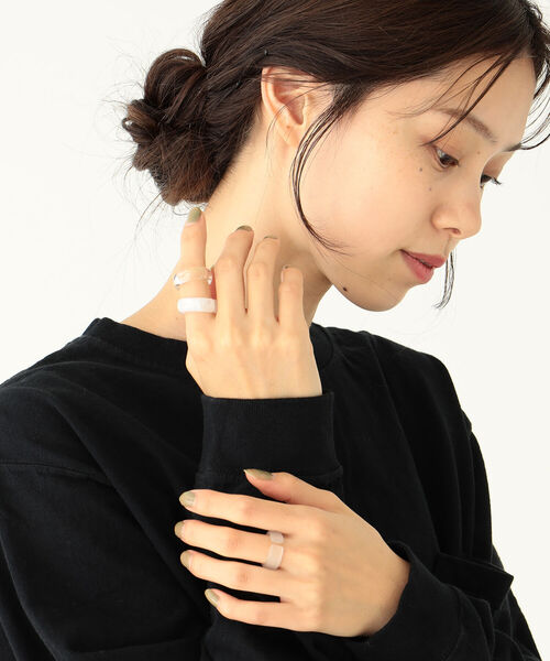 この夏のトレンドアクセサリー 幅広のフォルムで質感が異なるデザインのアクリルリングです。コーディネートにプラスするだけでこなれ感がぐっとUPするアイテム。トレンドライクなクリアカラーは手元、ネイルを綺麗に美しく見せてくれます。シンプルに単体使い、ボリュームのあるメタルリングや華奢リングとの重ね着けもおすすめのひと品です。 ※サイズは多少個体差がございます。 ※BLUE,PURPLE,YELLOWのクリアはマーブル調ですので、個体差がございます。 ※光の当たり具合やパソコンなどの閲覧環境によって実際の色味と異なって見える場合がございます。予めご了承ください。 ※商品の色味は商品単体で撮影した画像をご参照ください。 【アクセサリー・小物雑貨の取り扱いについて】 ・貴金属は、体質により、かゆみやかぶれを生じる場合があります。 ・皮膚に異常を感じた場合は直ちにご使用を止め、専門医にご相談下さい。 ・家事やスポーツ、就寝時や乳幼児の世話をする時などは、身体に危害を及ぼす場合がありますので着用を避けて下さい。 ・熱伝導が高いので、高温の場所や寒冷地での着用は火傷や凍傷の原因となりますので着用を避けて下さい。 ・乳幼児が誤飲しないように、保管は十分にご注意下さい。