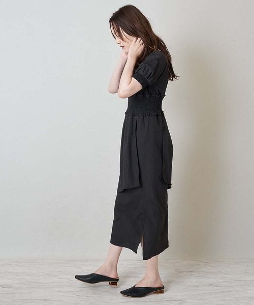 ◆アシンメトリーデザインが目を引くワンピース◆ ■デザイン ウエストと袖口に大胆に施したシャーリングデザインが 他にはない珍しいデザインで目を引きます。 スカートは前後共に二重仕様で、レイヤードデザイン。 左右非対称のアシンメトリーデザインが こなれ感を演出してくれます。 後ろの襟ぐりに紐が施され、 バックスタイルも華やかな仕様に。 左前側の裾にスリットが施されています。 場面を選ばずにお召いただきやすいブラック、 これからの季節にピッタリの明るいオレンジの 二色展開です。 ■スタイリング 一枚で存在感あるワンピースなので、 単品づかいがおすすめです。 合わせるシューズはフラットなバレエシューズから ヒールのあるものまで、幅広く相性◎ ■着用感 ポリエステルのさらっとした素材感が、着心地◎ オレンジカラーは顔写りをより明るく、 ブラックの色味は、全体をモードな印象に スタイリングをブラッシュアップしてくれます。 …………………… 透け感:なし 厚さ:やや薄手 伸縮性:やや有り ……………………