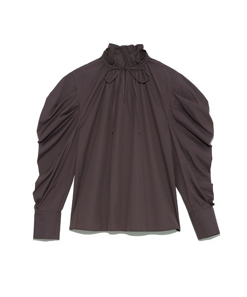 【甘さとモード感を絶妙なバランスでMIXしたスタンドカラーブラウス】【Design/Styling】構築的なボリュームスリーブが目を引く、女性らしさの中にモード感を漂わせるスタンドカラーブラウス。カフス袖や袖のタックは甘くなりすぎないようバランスを調整し細部にまでこだわり仕上げました。襟のフリルはボウタイリボンの絞り具合で調節可能。ボトムにアウトもインもしやすい丈感に仕立てているので、スカートともパンツともバランス良く決まります。【Fabric】しなやかな落ち感のある生地はエコレーヨンを34%使用。着まわしやすいホワイトはブラックのボウタイが締め色に、柔らかな雰囲気のライトベージュ、シーズンムード高まるダークブラウンの3色をご用意しました。【Eco Rayon】再生可能資源である木材を原料としたパルプを用いた繊維を使用しています。透け感;なし(WHTのみ:ややあり)裏地;なし伸縮性;なし光沢感;なし生地の厚さ;普通※照明の関係により、実際よりも色味が違って見える場合があります。またパソコン・スマートフォンなどの環境により、若干製品と画像のカラーが異なる場合もございます。予めご了承ください。商品の色味は、商品単品画像をご参照下さい。※商品画像はサンプルのため、色味やサイズ等の仕様に変更がある場合がございますので、予めご了承ください。
