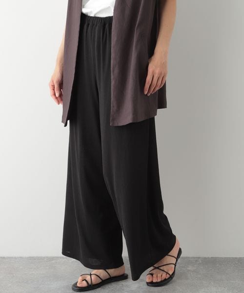 ーーー 涼し気な印象のリラックスパンツ 《素材》 凹凸感のある楊柳素材で落ち感があり、軽やかな着心地です。 《デザイン》 清涼感のある、夏にぴったりのイージーパンツ。 脚のラインを拾いにくいワイドシルエットで、リラックス感があり、 お出かけだけでなく、お家時間にもおすすめです。 ーーー