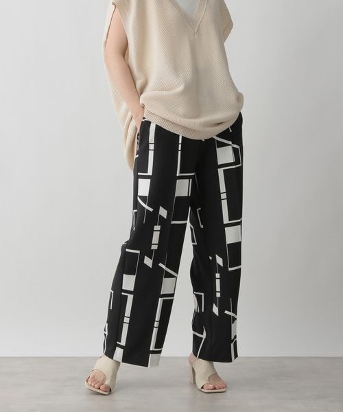 ーーー ■素材特性■ 肌触りの良いポリエステル素材で、さらっとしたドライタッチな素材なので夏でも快適にはける素材です。 ナチュラルストレッチなので、穿き心地も良い素材です。 ■デザイン■ 今年らしい大胆なジオメトリック柄が新鮮なプリントパンツです。 素材は少しハリ感のある麻調素材のため、大人っぽくきれい目に穿けるパンツに仕上げっています。 ーーー ■スタイリング例■ 柄がポイントのプリントパンツなので、トップスは羽織りシャツやシンプルなトップスがオススメです。 メッシュプルオーバーのようなざっくりとしたトップスと合わせると、夏らしい清涼感があるスタイリングが完成します。